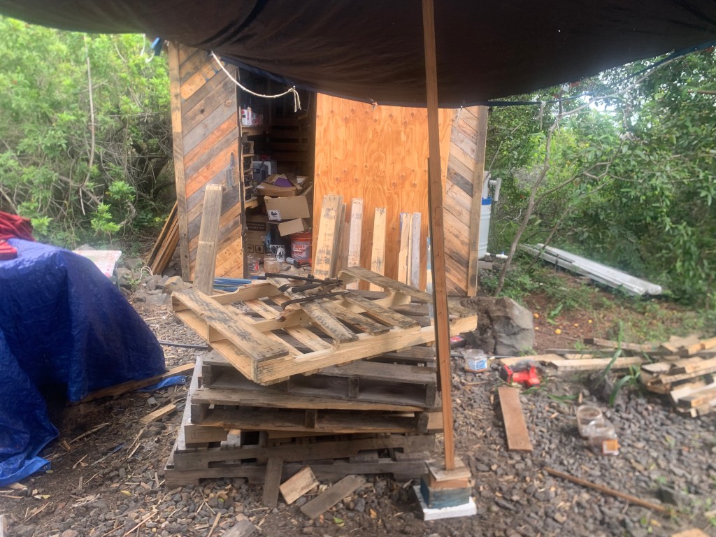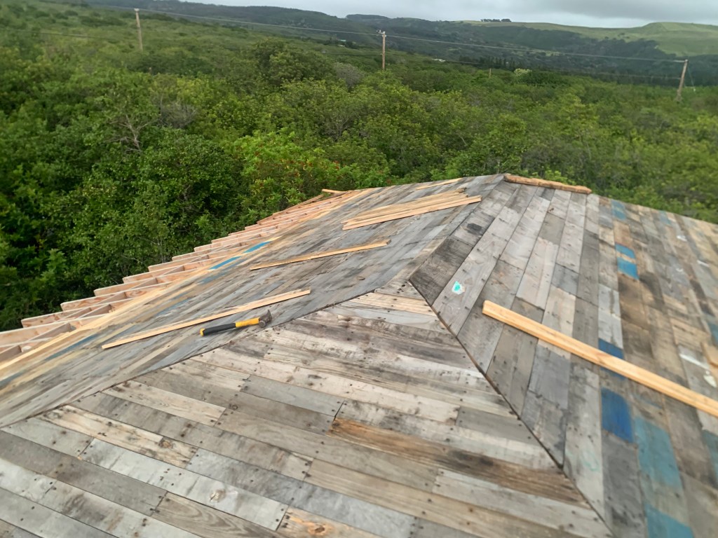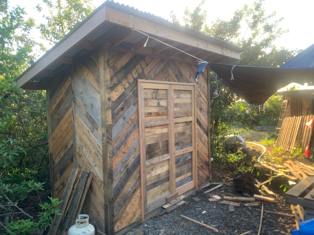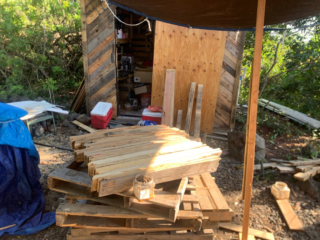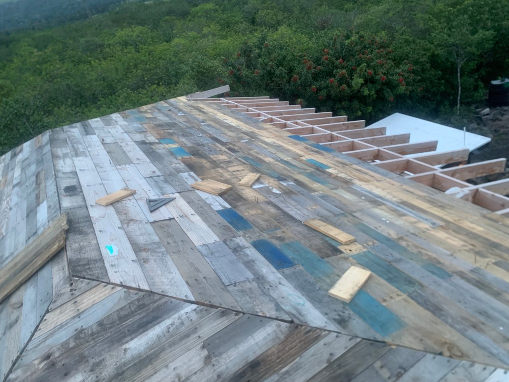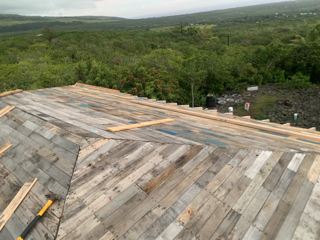 Adding a bit of “pre-treat” to the pallet boards used as sheathing may not exact;y stop the bugs, but it is worth the effort! I even spray a bit on the OSB before placing it and screwing it down.