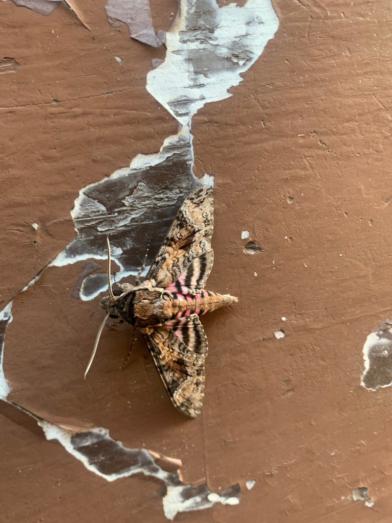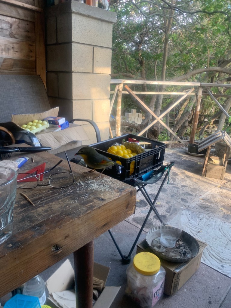 While I was sitting on the wooden bench outside the store where the bus stops, this guy landed on the bench next to me!