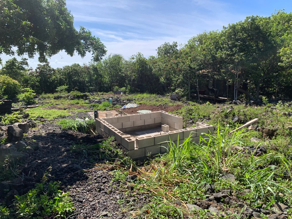 At one side of the kitchen gazebo, I had built up some rock walls and backfilled behind them to create a flat area for a second lanai. Today, I set up some forms around this area so that I can pour concrete here. I won’t have time this trip to pour the concrete, but this is one step closer!